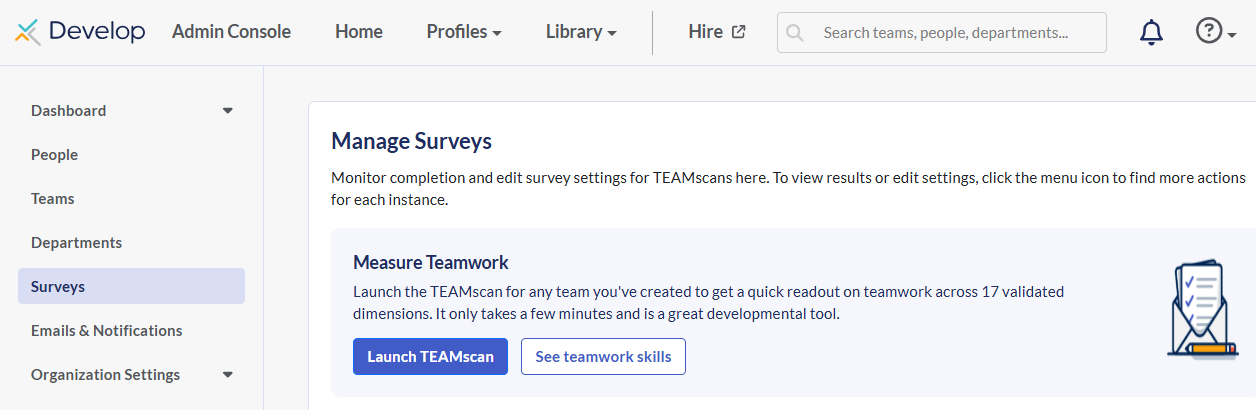 As an admin user for your organisation's Develop by Criteria account, you can launch a TEAMscan survey for your whole organisation, a department or a specific team.