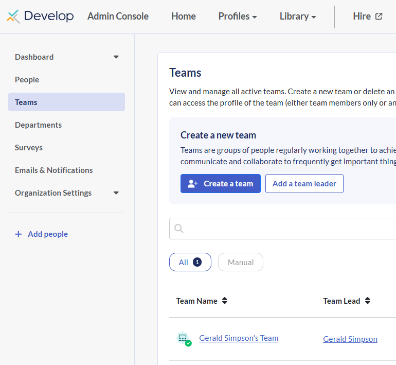 - To go to a specific team's profile, click the Teams tab with the Admin Console.