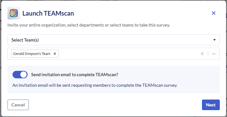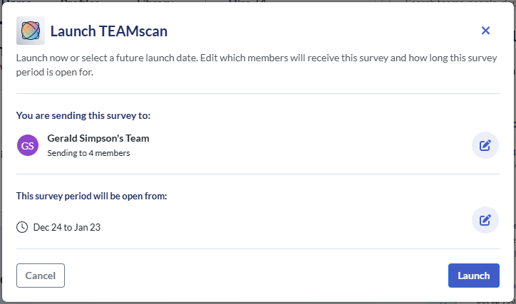 - Click Launch, then click Launch again. All team members within the specified groups will be sent an invitation to complete TEAMscan.