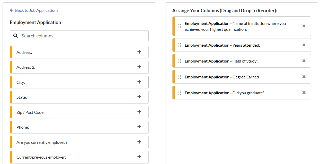 This will depend on the Job Application Forms you have created in your Criteria account. Each question in each form will be available to add to the report.