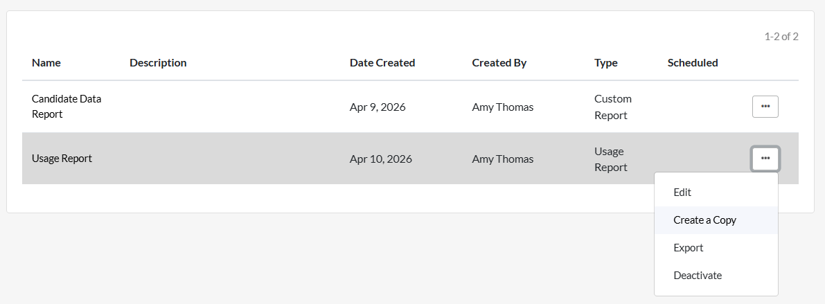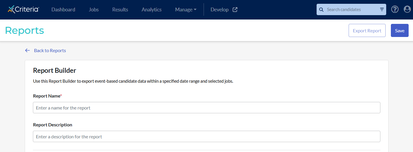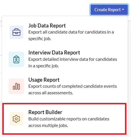 The Report Builder lets you create customized reports on candidates across multiple jobs. Depending on your subscription, you can include data such as candidate details, proctoring outcomes, assessment results, structured interview results, and application form responses.
