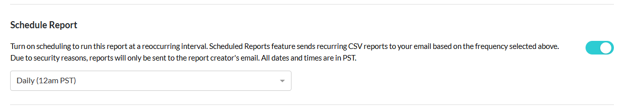 You can run a report immediately or save it to use again later. When you run a report, it’s generated in the background and emailed to you once ready; the delivery time will vary based on the amount and complexity of the data selected. You can also schedule reports to run automatically.
