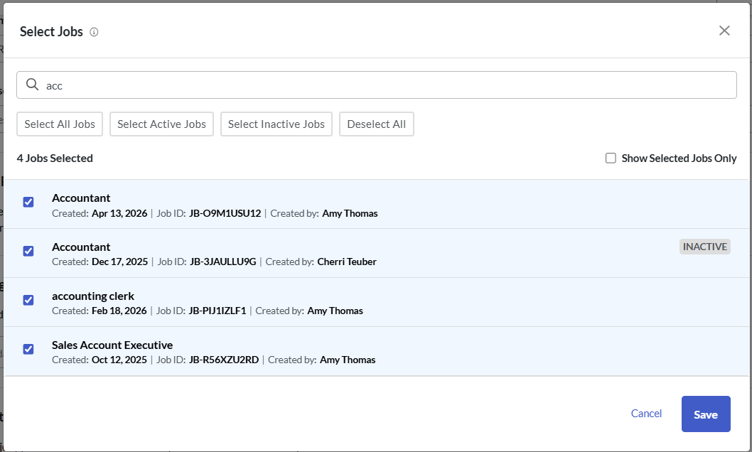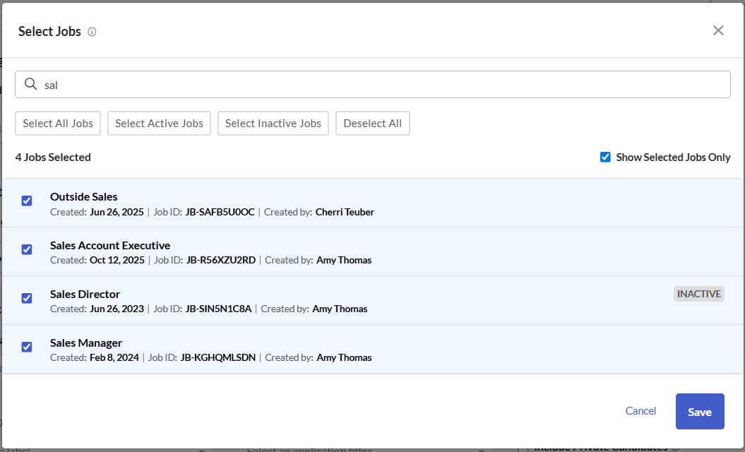 Note: if you select All Jobs or All Active Jobs, this will not automatically update to include jobs created after the report was saved.