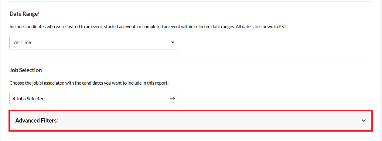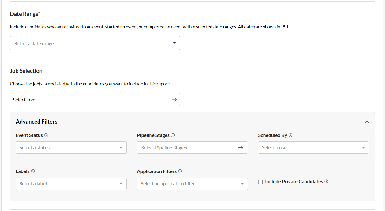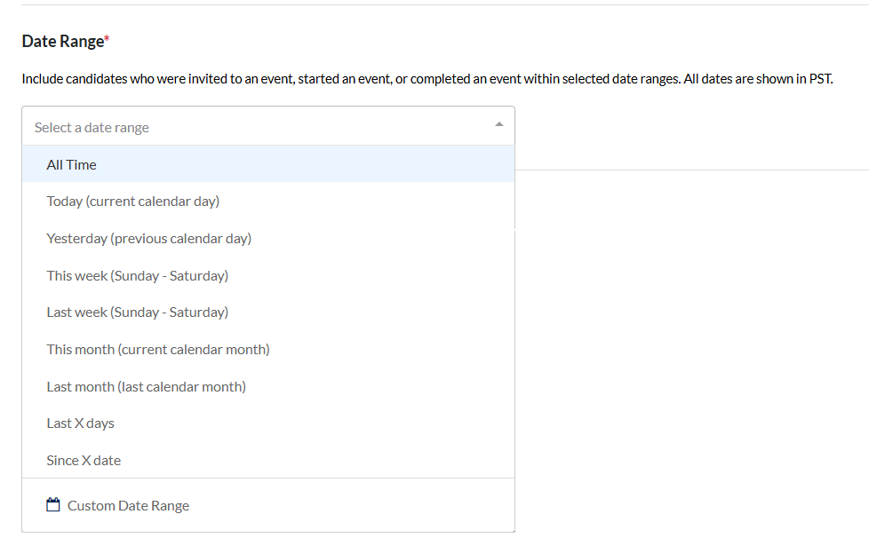 Any event where any test activity occurred during the specified time period will be included in the report. Examples include: candidates being invited to complete testing, candidates completing testing.