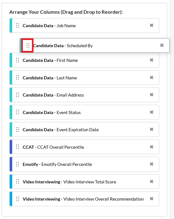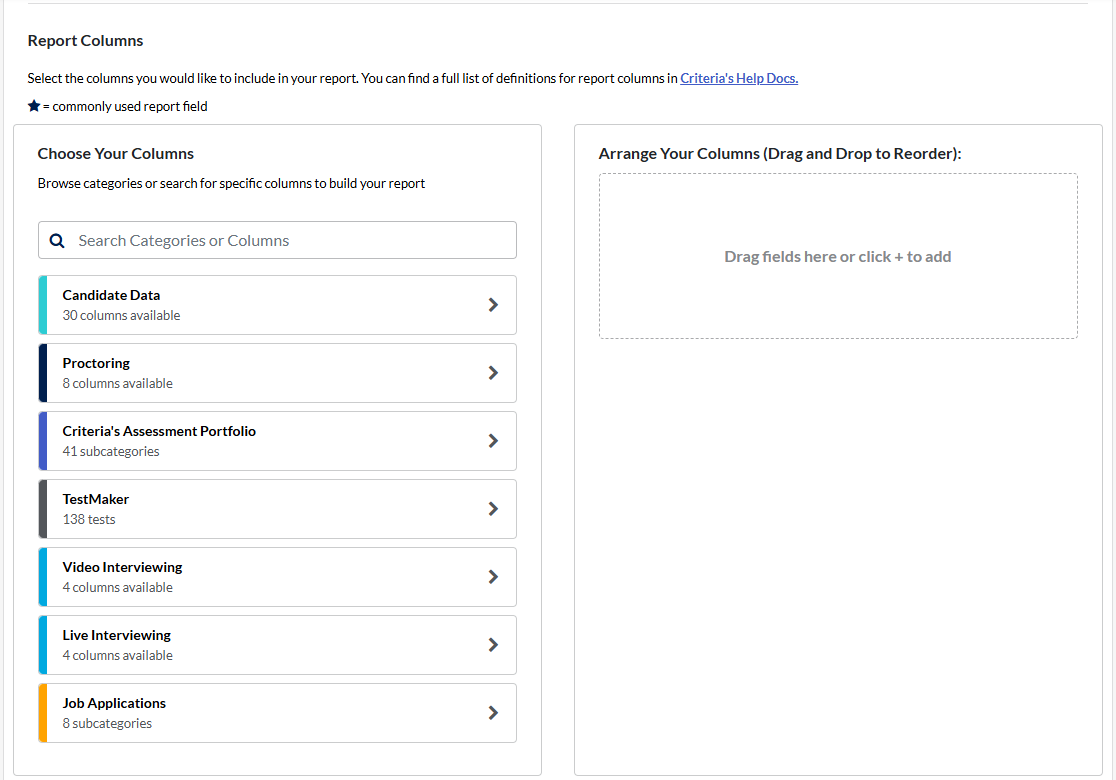 Select the columns that you want to appear in the report. You can include assessment data, proctoring data, some video interviewing data and your candidates' application form responses in this report.