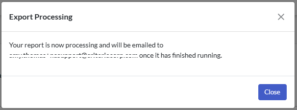 - Click Export Report to generate the report. Your report will be processed and emailed to you. You can close the pop up message to continue with your work while the report is generated.