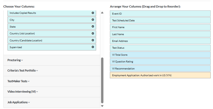 You can include assessment data, proctoring data, some video interviewing data and your candidates' application form responses in this report.