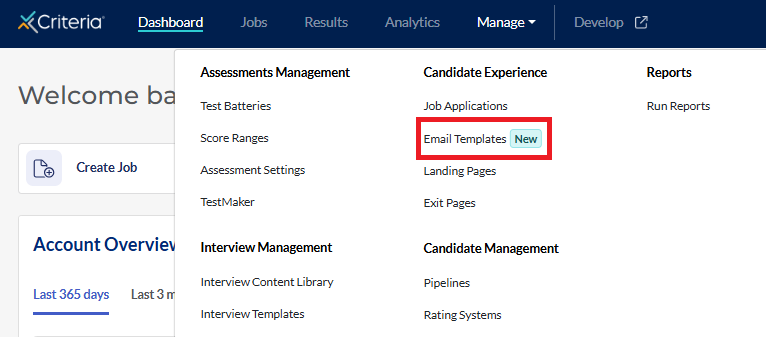 - Click Manage in the top navigation bar, then click Email Templates.