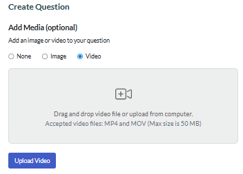 When adding video files or images to a question we recommend checking the parameters, to ensure the best candidate experience. This helps with faster loading times for the candidate, particularly if they are using a mobile device or they are on a slower internet network.
