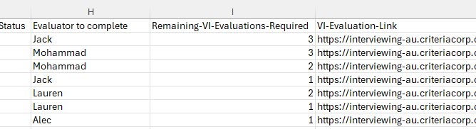 - Send each evaluator their list of candidates. They will need to click on each VI-Evaluation Link in the spreadsheet to access the evaluation. However, if they are completing multiple evaluations within a 24 hour period, using the same browser, they will only need to complete the verification process once per day.
