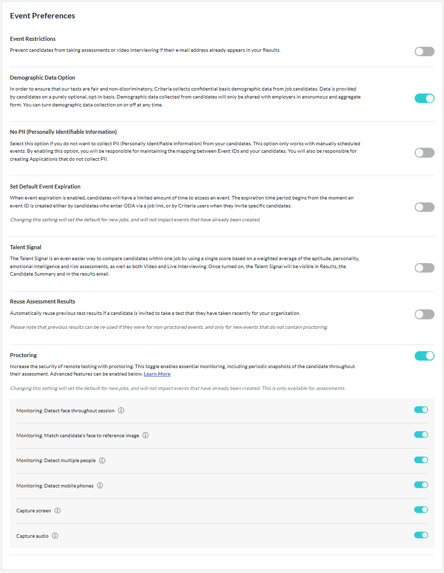 Once enabled for your organization*, this is turned on by default. Proctoring will automatically apply to all new jobs created. This can be turned on or off at the organization level (here in Company Preferences), at the job level or at the candidate level