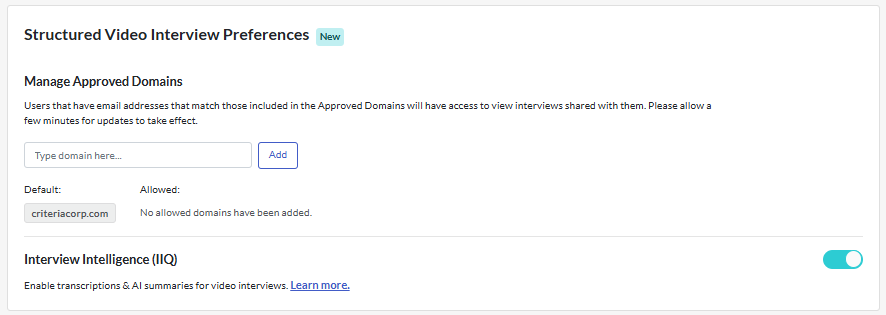 Add the email domains of any users (everything after @ in the email address) to allow access to view interviews that have been shared with them.