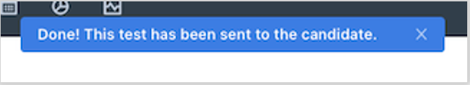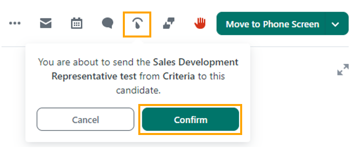 When a candidate is placed in a stage with assessments, a dial icon will appear at the top of the candidate’s profile. Click the dial icon, then click Confirm to send the assessments.