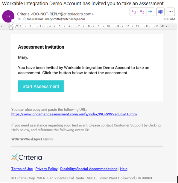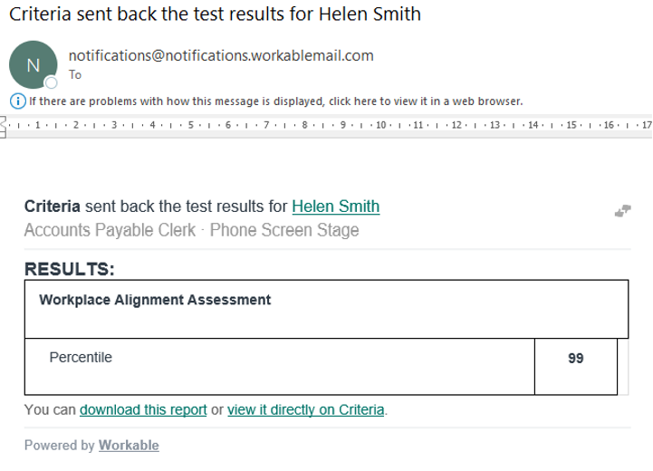 Once the candidate completes the assessments, the Workable users following the candidate will receive an email notification from Workable. If the Criteria users have completion notifications enabled in Criteria, an email will also be sent from Criteria. Users may want to turn off email notifications in Criteria to avoid receiving duplicate notifications.