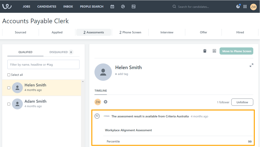 - Click the candidate's name to view the candidate details and results in Workable. You'll need to login to Workable before the page will load.