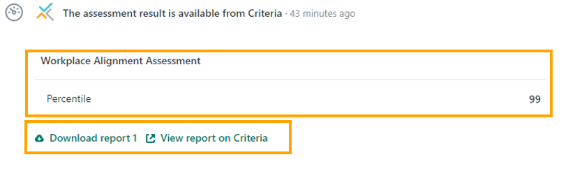 The timeline section will display a heading for each assessment the candidate completed, with the score breakdown below. There are also links to download/open the Criteria PDF report and view the results directly from the Criteria platform (Criteria login required).