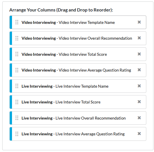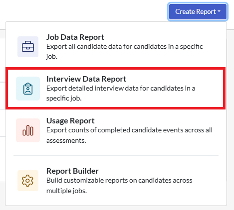 The Interview Data Report allows you to export your candidates' interview results for a specific job. This report provides additional information that is not available in the Report Builder.