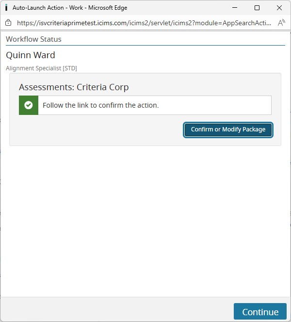 - iCIMS will open a popup for the status change process. You may see a Confirm of Modify Package button, if so, it may be is required so you should click it to confirm the invitation was successful. Then click Continue.