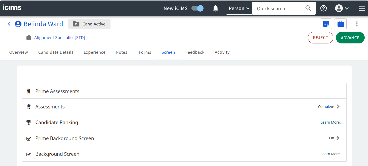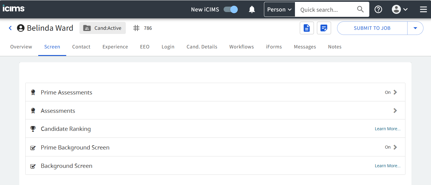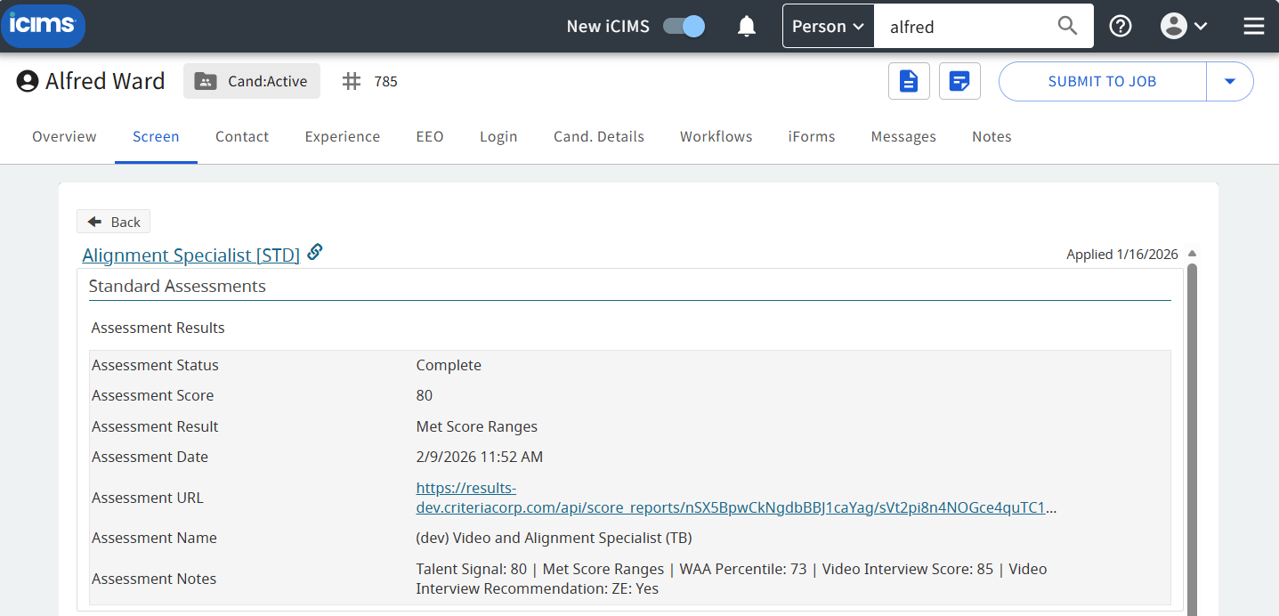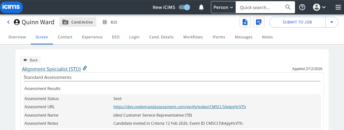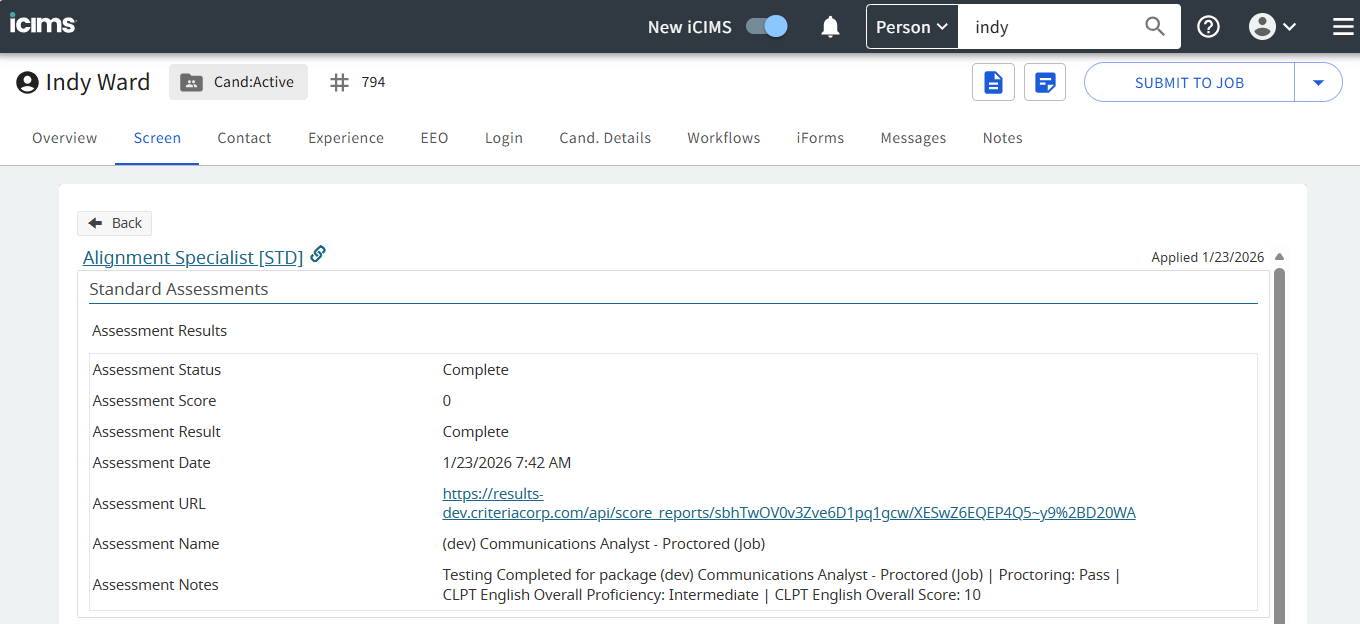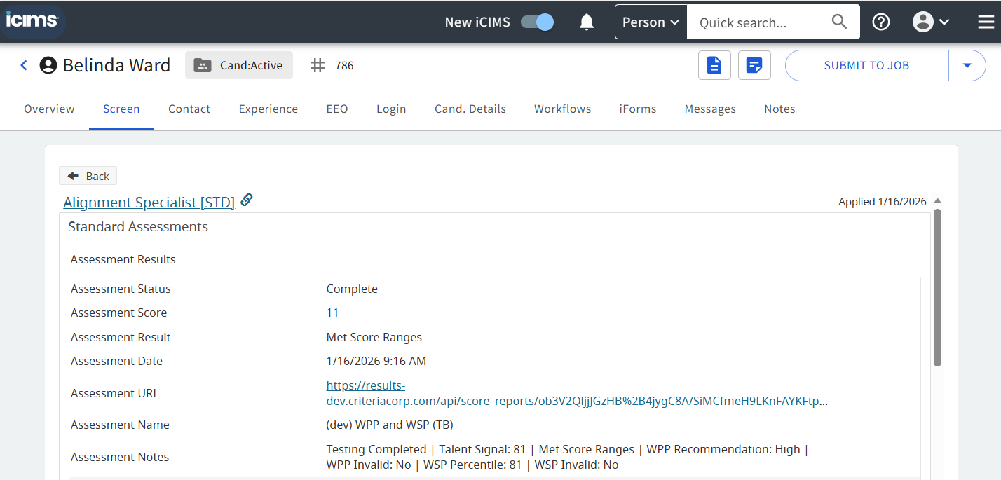 - Once the assessments are completed the results will be available in iCIMS