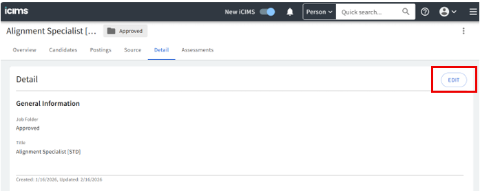 - Select the Edit button in Details tab of the job req in iCIMS