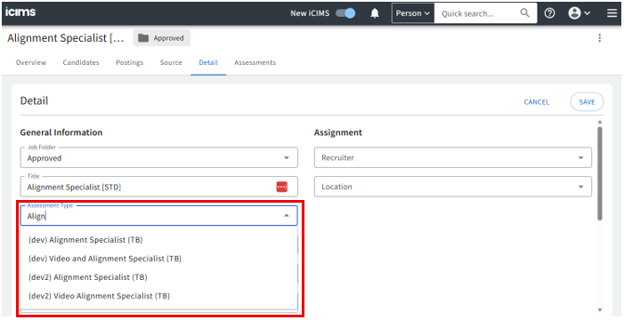 Check the Assessment Type field on the iCIMS Job.