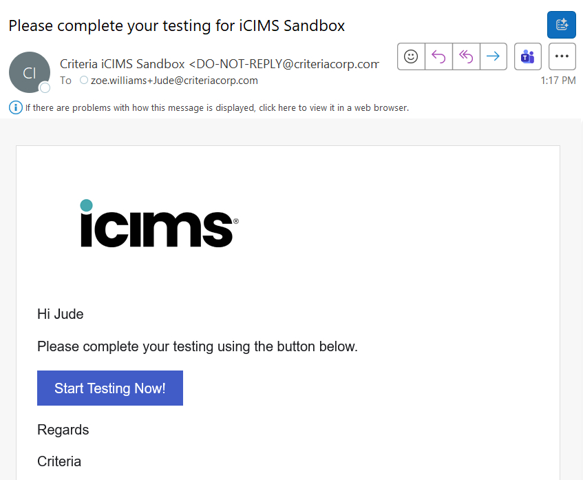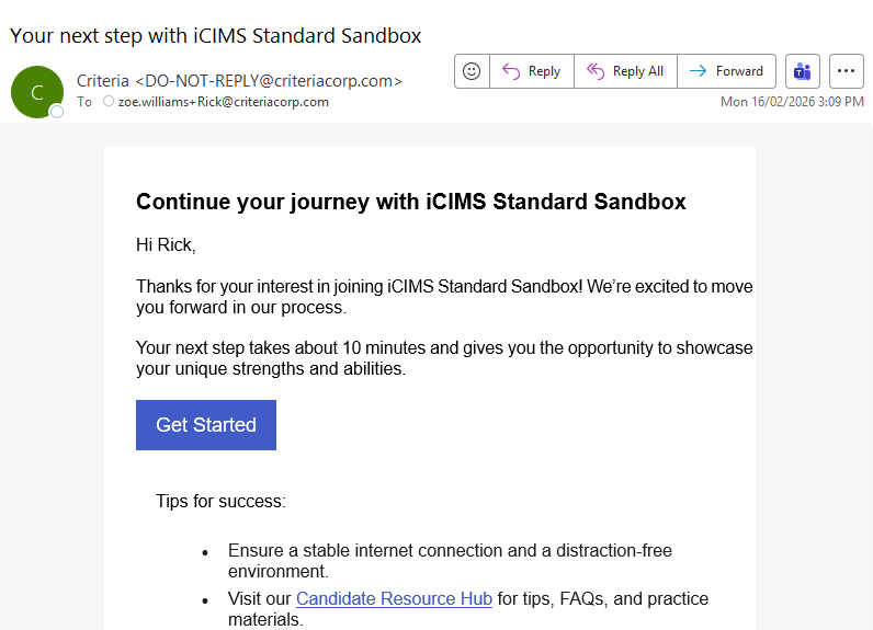 - The candidate will also receive an invitation email in case they wish to complete their testing and resume their application later. (Talk to Criteria if you wish to disable this email.)