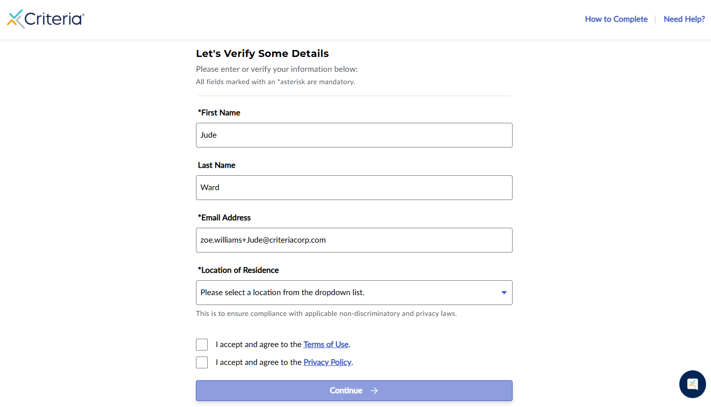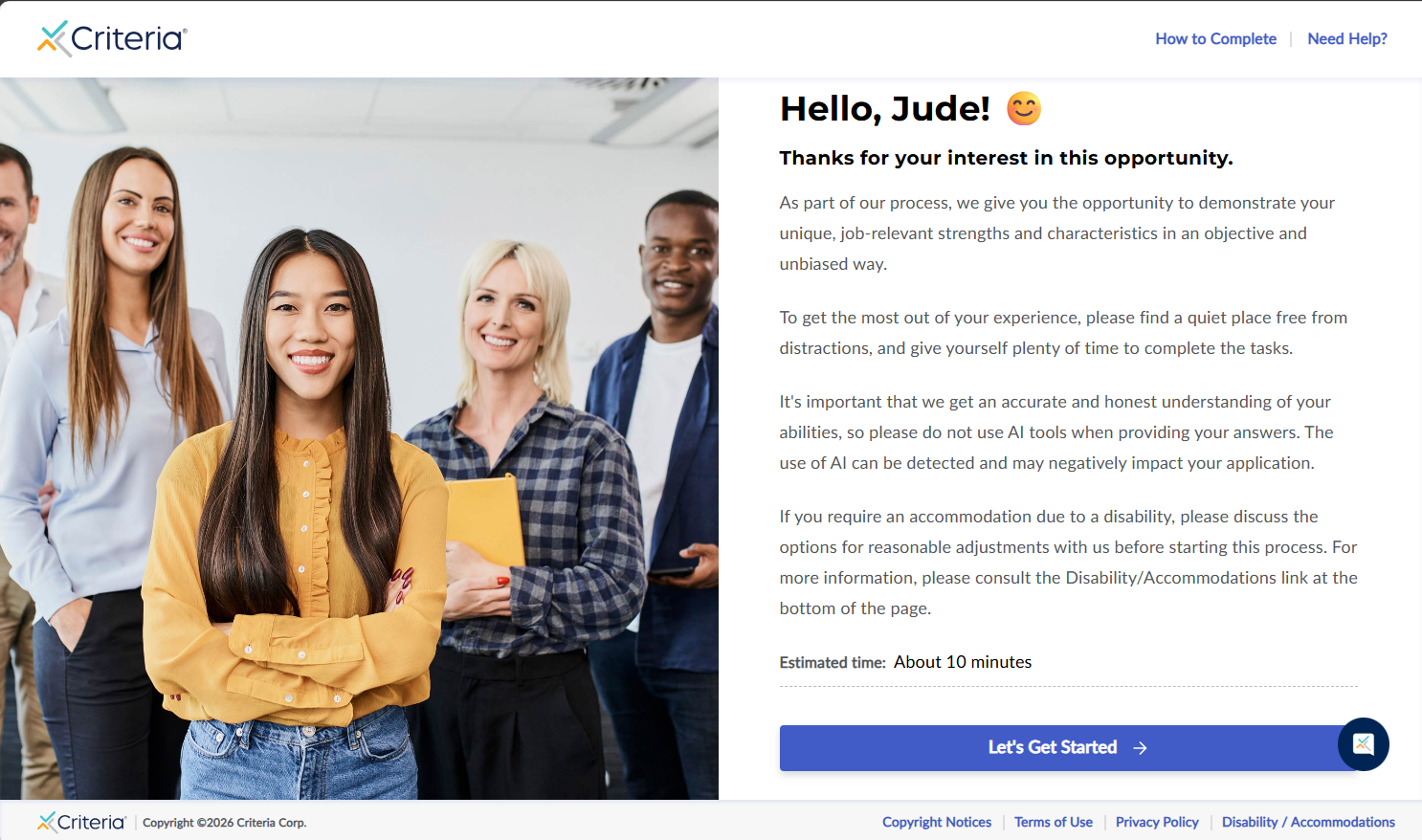 - A new browser tab will open and the Criteria candidate experience will open to the landing page. This means that the candidate was successfully invited. You can close this tab, do not continue, the candidate will need to complete this testing.