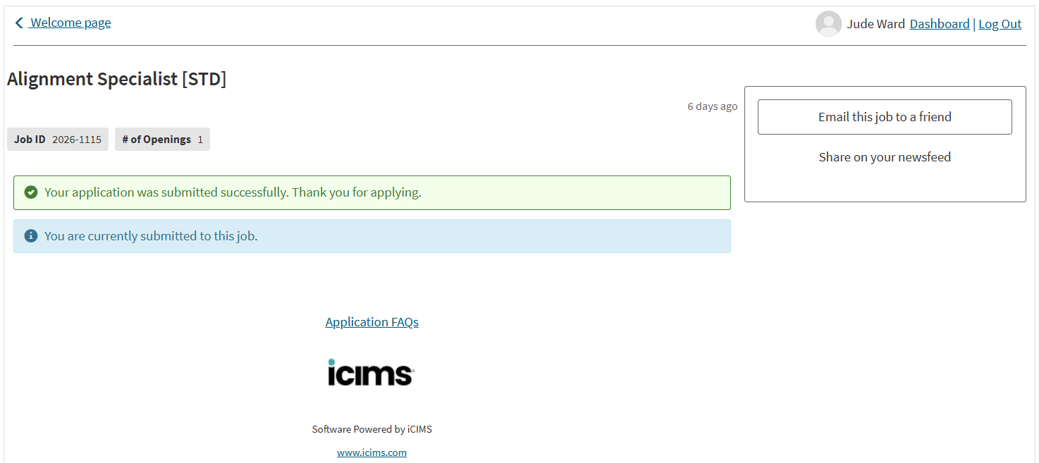 - The iCIMS application will be automatically submitted.