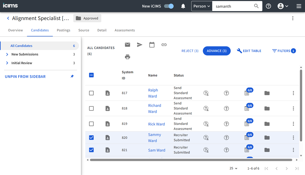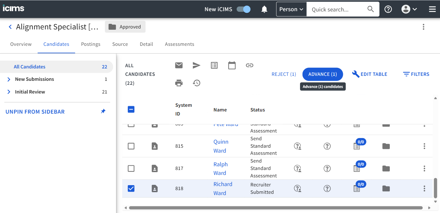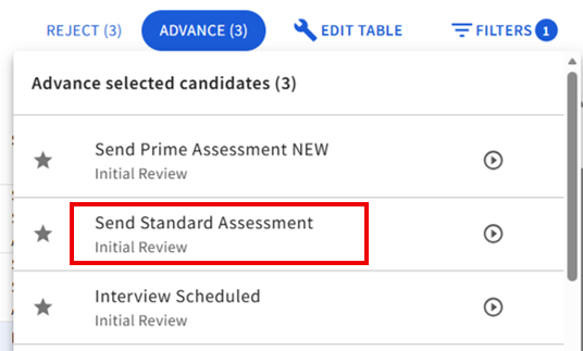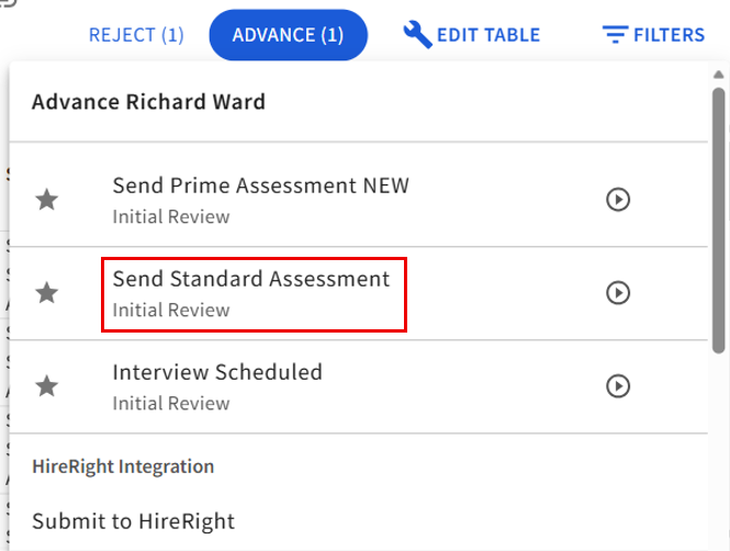 - To trigger the assessments, simply select the candidate and then choose Advance to move them to another status.