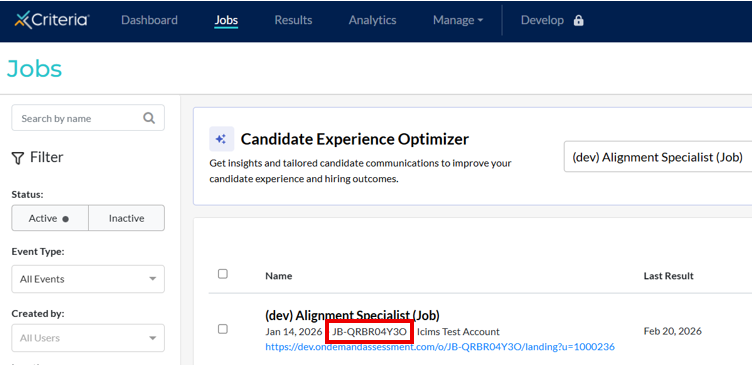 To find the Job Code, go to the Jobs page in your Criteria account and look for the text string under the job title that starts with "JB-". E.g. JB-QRBR04Y3O.