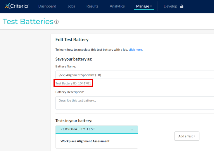 To find the Test Battery ID, go to the Test Batteries menu in your Criteria account. Click on the Test Battery you want the ID for. Tip: Make sure the Test Battery is only associated with 1 active job to ensure the integration works properly. The Test Battery ID is on the details page. The Test Battery ID is also available on the Job Settings page.