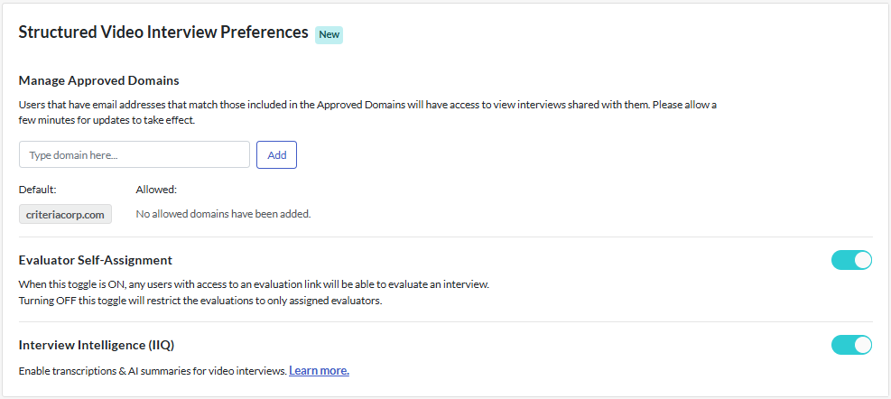 If you have structured interviewing enabled for your account, toggle on to enable transcriptions & AI summaries for video interviews..
