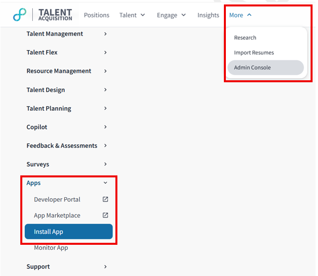 - In Eightfold, navigate to More > Admin Console > Apps > Install App