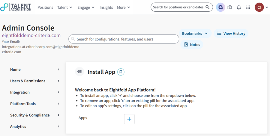 Now that the Stage/s are set up in Eightfold, and you have your Criteria API Key, you can install the Criteria App in Eightfold.