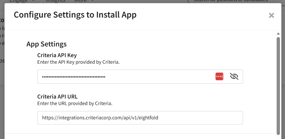 - In the Configure Settings to Install App popup box, paste in your Criteria API Key. This will be a string of letters and numbers. Make sure you do not accidentally copy any spaces at the beginning or end of the API key. Click the eye icon to view the API key.