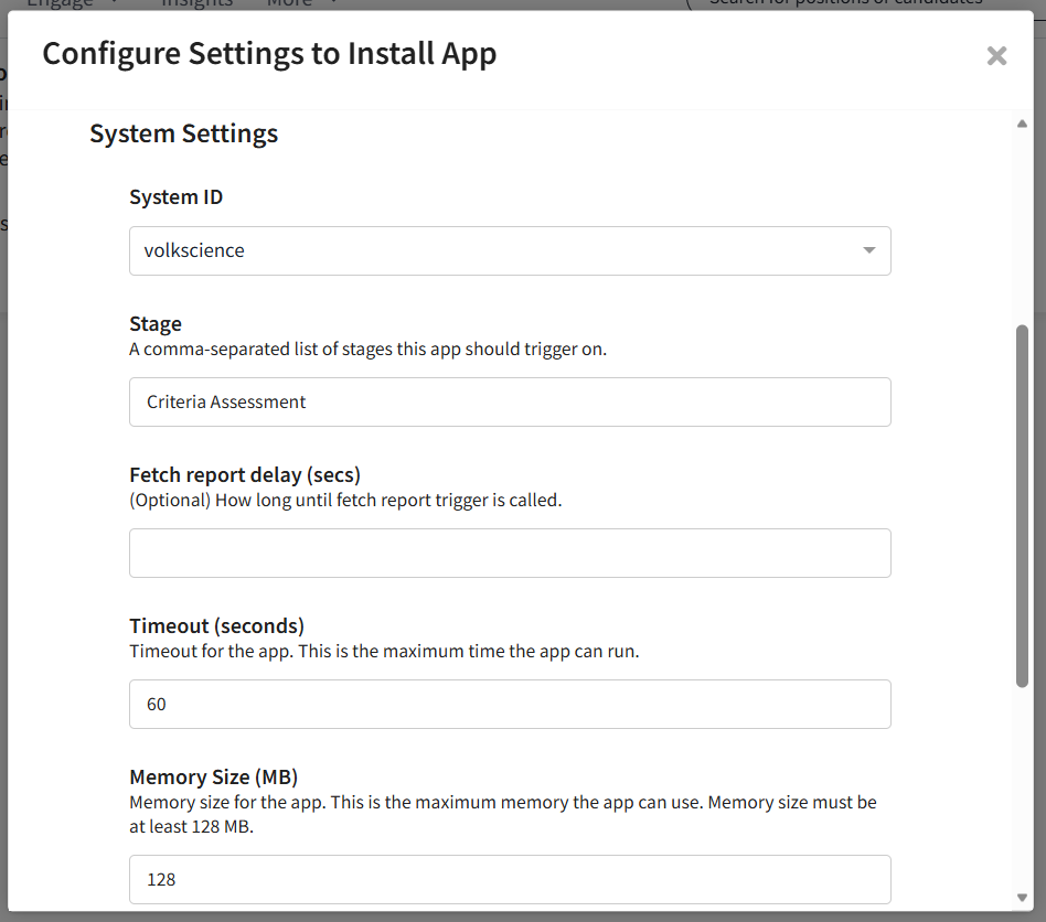 - Scroll down to the Stage field in the System Settings section. Enter the name of the stage in Eightfold that you will be using to trigger Criteria testing. Enter this exactly as it appears in Eightfold. If you are using multiple stages, enter them all here, separated by a comma e.g. Criteria Assessment, Criteria Round 2.
