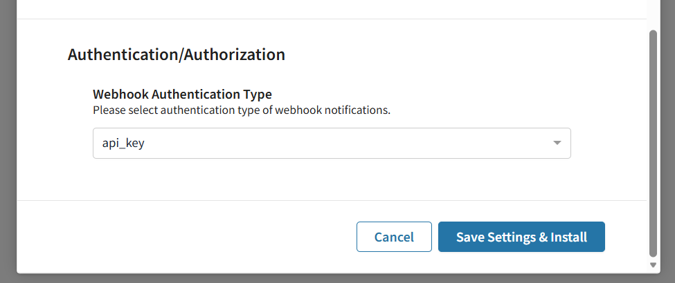 - The last section is Authentication/Authorization. In the Webhook Authentication Type field, choose api_key.