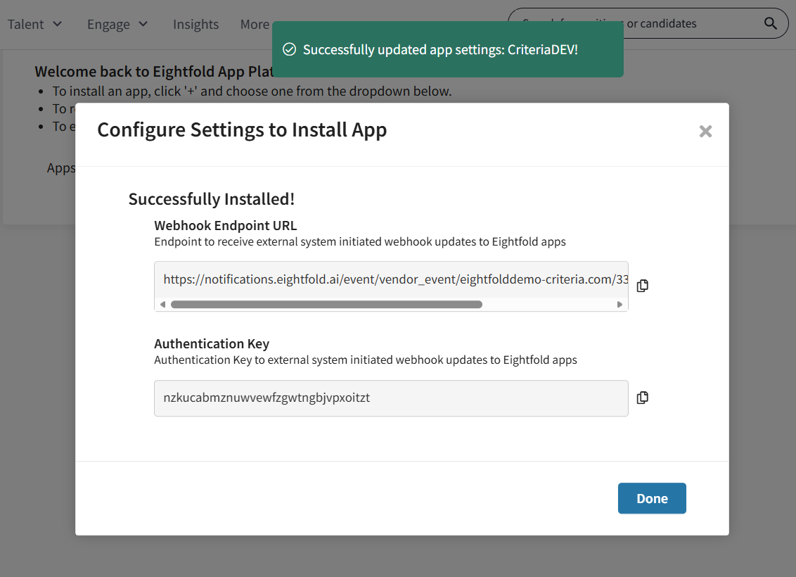 - A popup will be shown to indicate the app has been installed and you will be shown the details that Criteria needs to interact with Eightfold. Copy the Webhook Endpoint URL and Authentication Key values and provide these to Criteria. Tip: Use the copy icon after each item to easily copy the whole value.