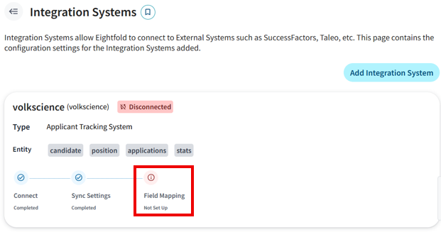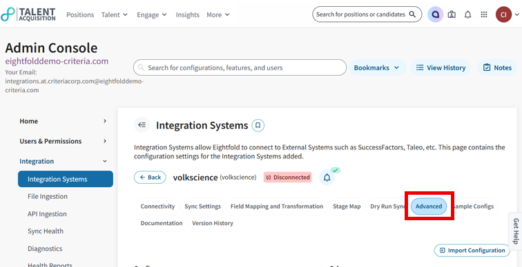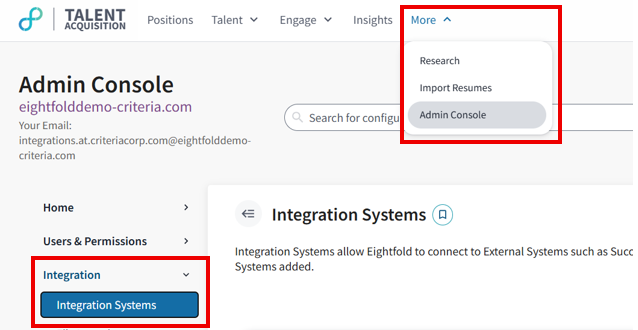 - In Eightfold, navigate to More > Admin Console > Integration > Integration Systems.