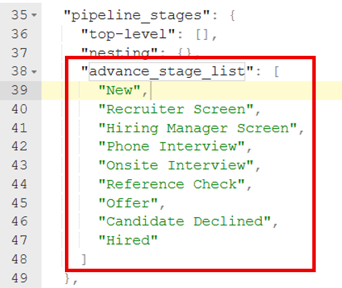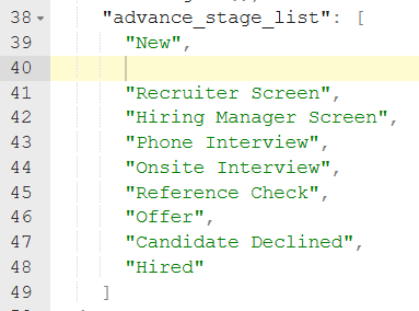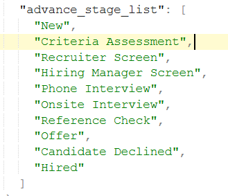 The advance_stage_list is a list of the stages in your Eightfold account that are configured to allow advanced setup to be applied to them. Each stage name is surrounded by double-quotes, and there is a comma separating each item.