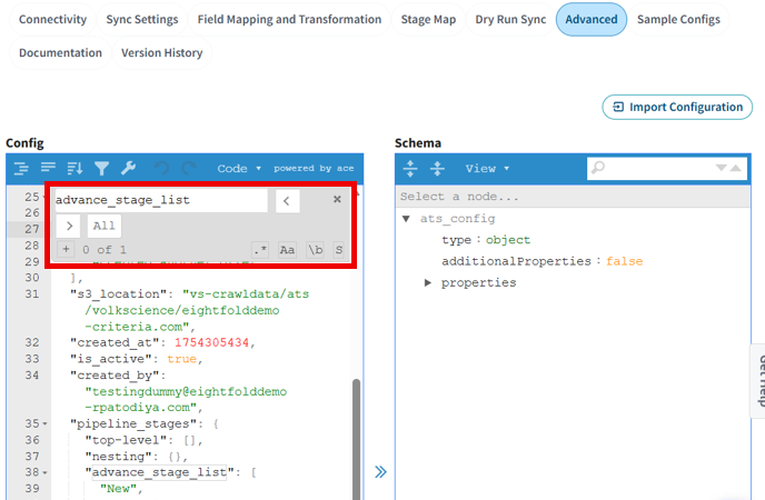 To find this section, click into the Config box and then press Ctrl-F (Windows) or Command-F (mac) on your keyboard to open the Find box. Copy and paste into the Find box the text - advance_stage_list