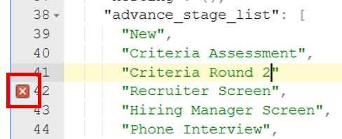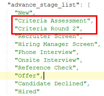 - You want to add your Criteria stage name with double quotes at either end and a comma at the very end. If your Criteria stage name is Criteria Assessment you will enter "Criteria Assessment",