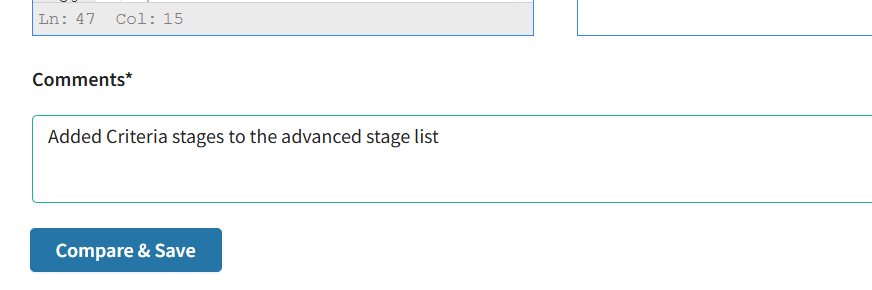- When you have finished adding the stage/s, go to the bottom of the page and enter a Comment about what you changed e.g. "Added Criteria stages to the advanced stage list"