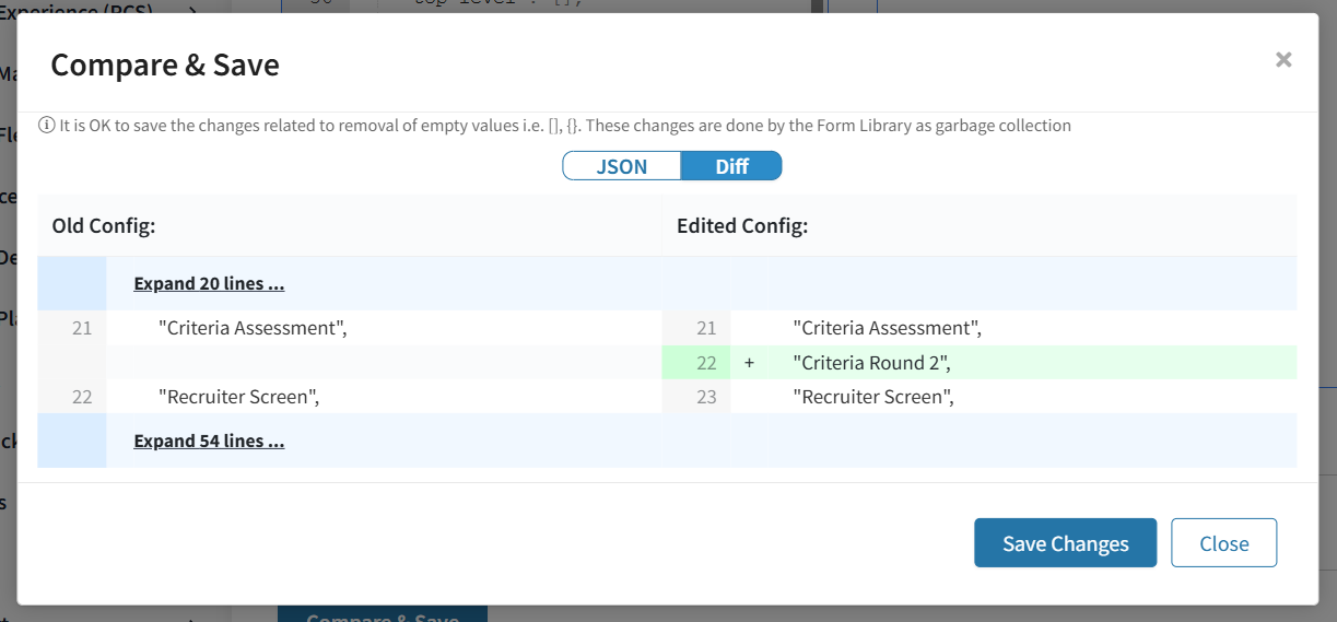 - A popup will show you what was changed, check that the only changes (highlighted in green in the right-side box) are for the Criteria stage/s you added. This screen shot, it is showing that we added our Round 2 stage called Criteria Round 2.