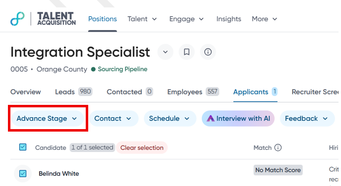 Or, on the applicant list page within a position, tick the applicant and then Advance Stage