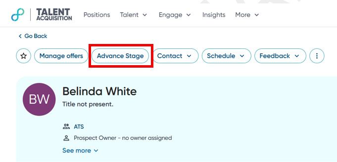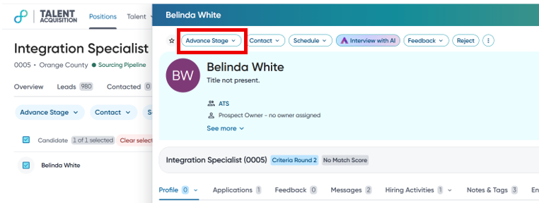 Or, on the applicant profile page, click Advance Stage, then click the radio button in front of the relevant Position