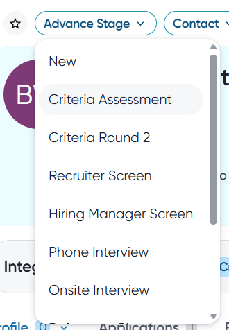No matter where you click Advance Stage, the next thing you need to do is to choose the Criteria testing stage to move them into.