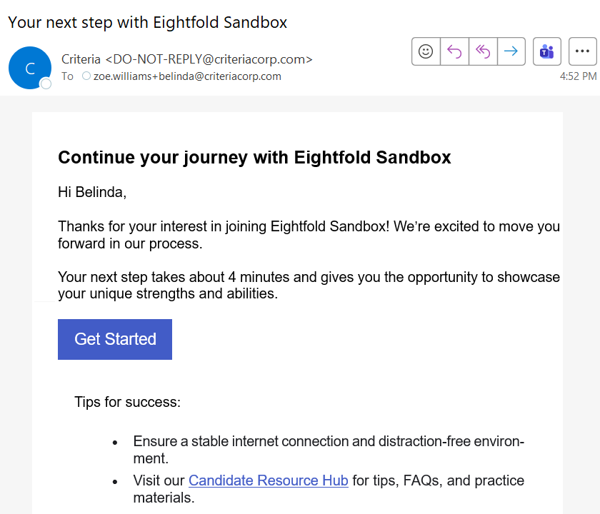 - Set up a stage in Eightfold to use as the trigger for inviting applicants to Criteria testing