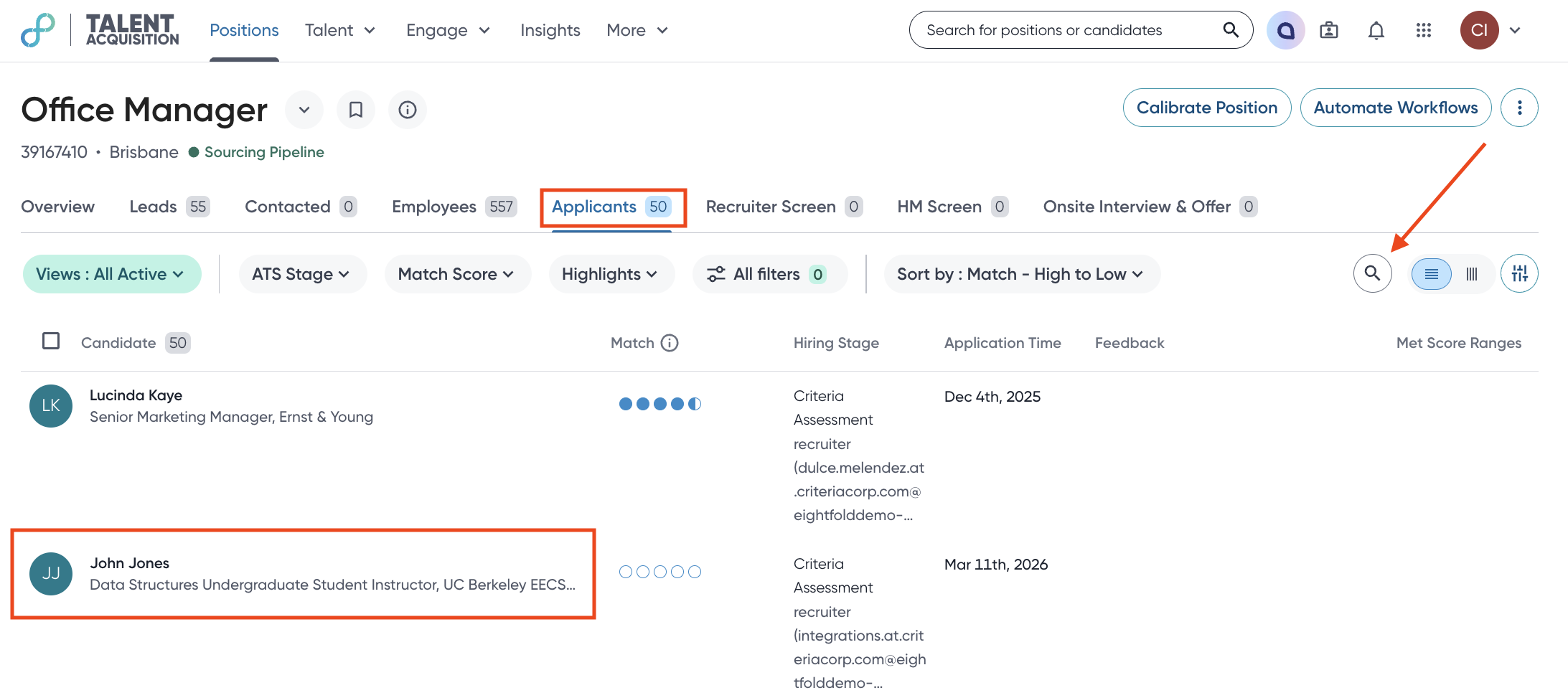 - After clicking into the desired position, please click the Applicants tab within the position. Then click on the name of the applicant whose assessment you'd like to review. If you know the name of the candidate you may search for them using the magnifying glass button as indicated by the red arrow.