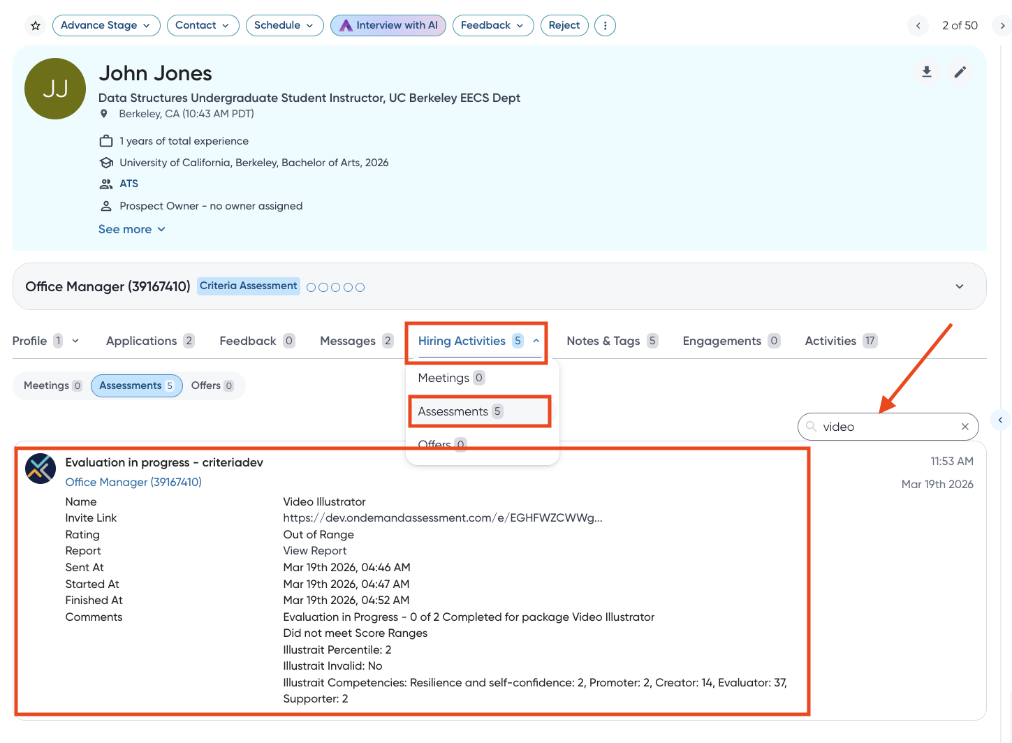 - Clicking on the applicant's name will open a popup on the right-hand side of the screen, displaying the applicant's profile. From here, please click the Hiring Activities dropdown and select Assessments. This will display all of the Criteria assessments that the candidate has been invited to/completed. If you would like to filter to a specific assessment result, you may use the search bar on the right-hand side of the screen and filter by the name of the Criteria package that was ordered.